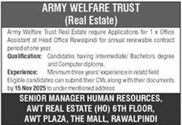 Candidates, if you are seeking Army Welfare Trust Jobs 2025 in Rawalpindi, yes. Then it would help if you tried to complete the Army Welfare Trust Jobs because here you can easily apply for this vacancy: Office Assistant.