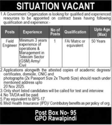 Candidates, if you are seeking Government Organization Jobs Vacancy 2025 in Rawalpindi, yes. Then it would help if you tried to complete these Government Organization Jobs because here you can easily apply for this vacancy: Field Engineer.