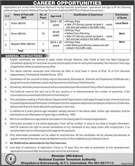 Candidates, if you are seeking NACTA Federal Government Jobs 2025 In Islamabad, yes. Then, it would help if you tried to complete this NACTA Federal Government Jobs application, as you can easily apply for the following vacancies: Driver (BS-04), Driver (BS-04), and Dispatch Rider (BS-04).